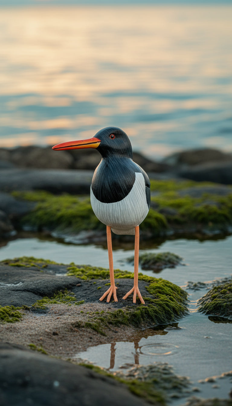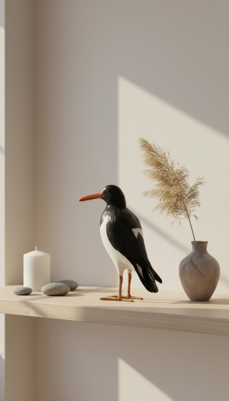 Laissez entrer le charme du littoral dans votre intérieur avec cet élégant Huitrier pie en bois de 24cm, sculpté à la main avec une précision délicate. Son plumage noir et blanc stylisé et son long bec orangé rappellent la grâce de cet oiseau marin emblématique.